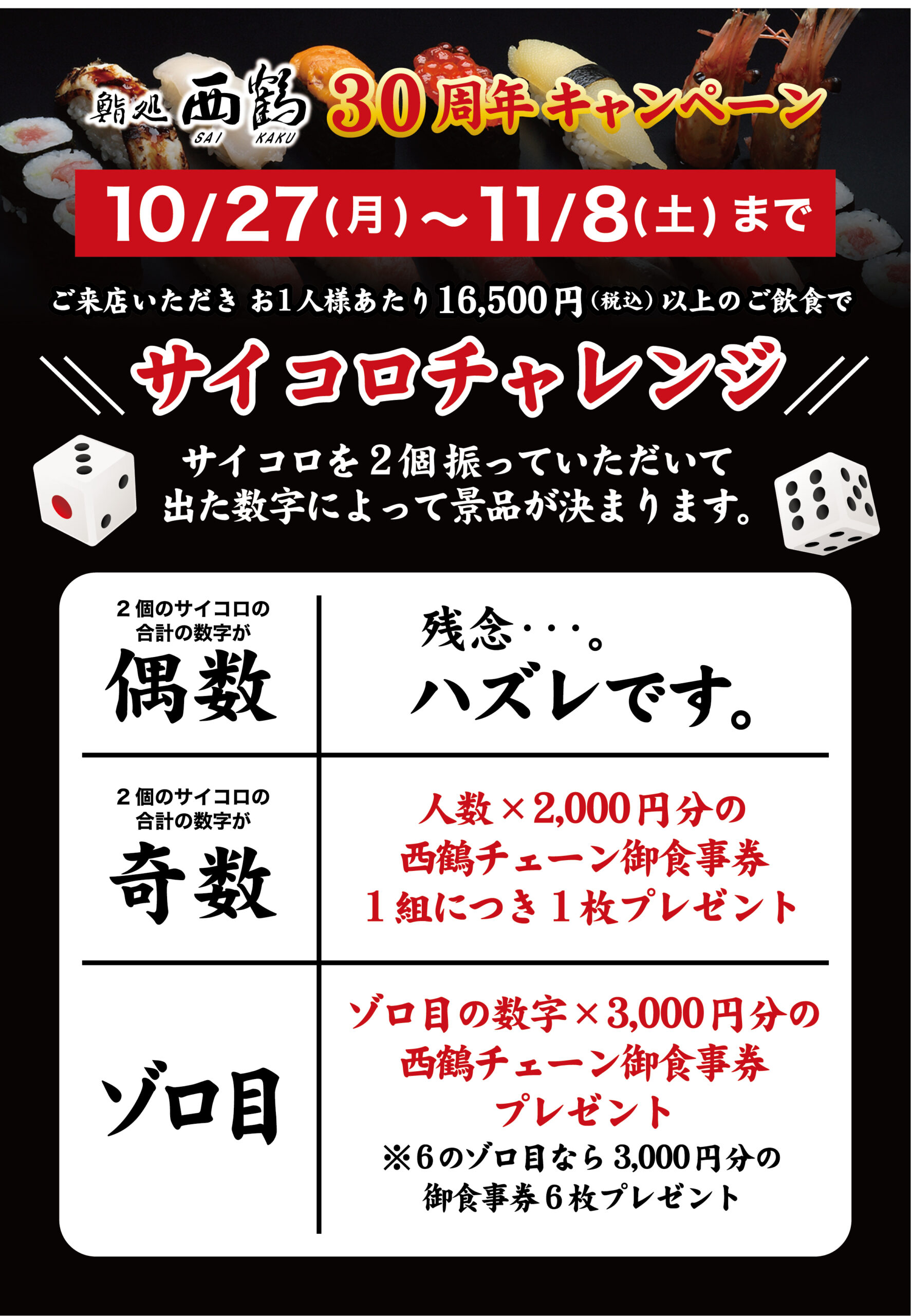 おかげさまで鮨処西鶴は今年で30周年を迎えることとなりました。
